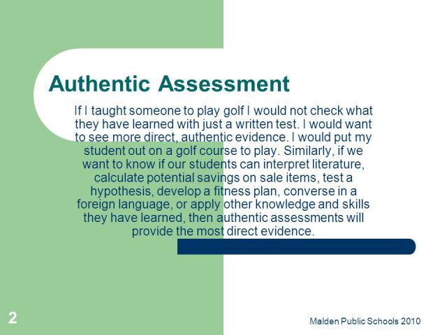 If I taught someone to play golf I would not check what they have learned with just a written test. I would want to see more direct, authentic evidence. I would put my student out on a golf course to play. Similarly, if we want to know if our students can interpret literature, calculate potential savings on sale items, test a hypothesis, develop a fitness plan, converse in a foreign language, or apply other knowledge and skills they have learned, then authentic assessments will provide the most direct evidence. Malden Public Schools 2010.